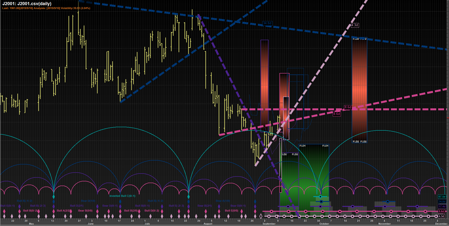 The first FLD pattern sequence (ref #0)projects a price movement DOWN to a target of 1837.92 by about 2019/8/22.