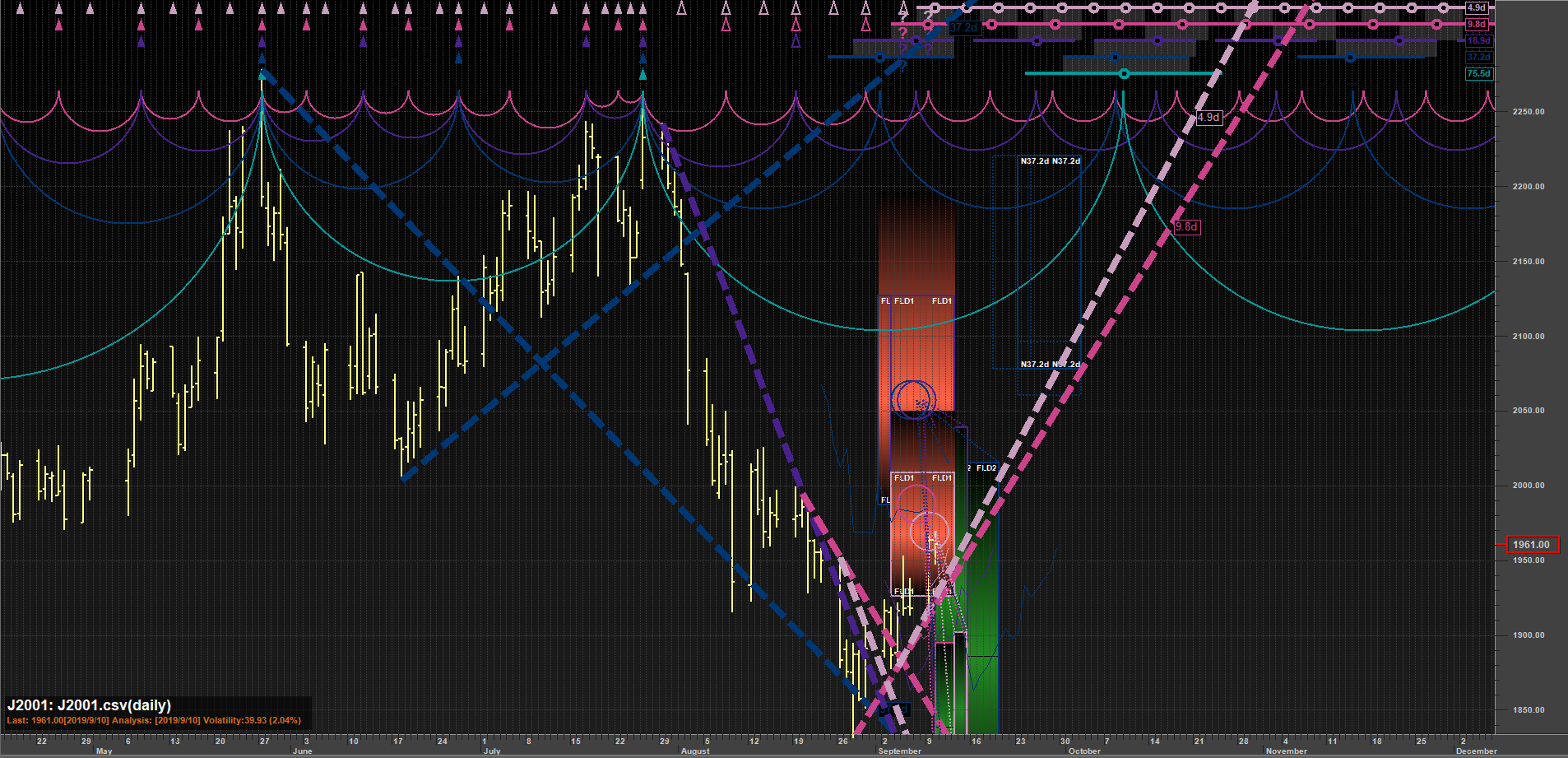 37.2d Normal FLD projection created on2019/9/10 projecting a price rise of 123.5000 to 2078.0000 by 2019/9/23. Thisis still a valid projection target.