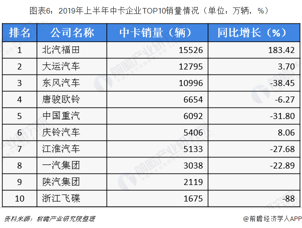 前十集团销量合计69434辆,市场集中度CR10达到96.43%。2019年上半年中型卡车销量前十名企业较2018年变化较大,其中重庆力帆跌出前十榜单,取而代之的是陕汽集团;前十榜单排名变化也较大,2018年东风汽车、浙江飞碟分列第一第二位,2019年上半年分别下降至第三和第十位;北汽福田和大运汽车分别从2018年末的第六位和第三位上升至第一位和第二位。2019年上半年,北汽福田中型卡车销量为15526辆,较上年同比增长183.42%;大运汽车销量为12795辆,较上年同比增长3.70%,同样中型卡车销量上涨的还有排在第六位的庆铃汽车,2019年上半年中型卡车销量为5406辆,较上年同比上升8.06%;其余企业中型卡车销量均呈下降趋势。