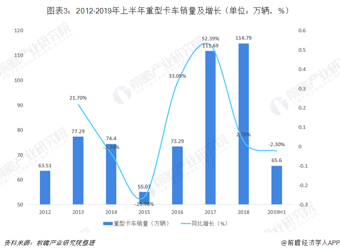 国家加大基础设施建设,产生的货运需求和工程建设需求保持着重型卡车销量的稳定。在汽车行业整体遇冷的环境下,重型卡车维持住了平稳趋势,销量仅有小幅下滑。2019年上半年,重型卡车销量为
