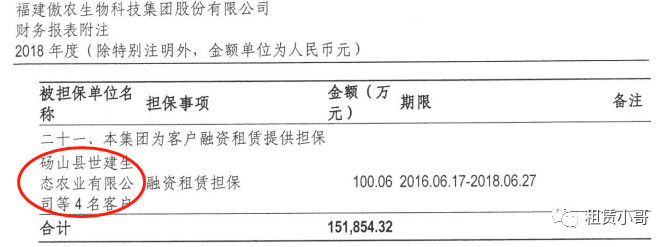 正在租赁小哥感到山穷水尽之时,似乎柳暗花明又一村了,在傲农生物的2018年度审计报告中有一小列对集团外客户做的担保的说明: