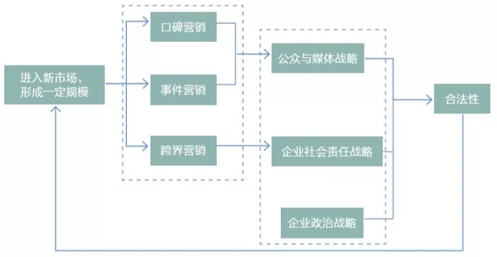 非市场战略主要应用于对利益相关者阻止其进入市场的行为作出反应。如图2所示,虚线框内即为优步所实施的市场战略与非市场战略。三类营销策略实施可以大大提升合法性获取的成功率。口碑营销与事件营销的目的之一是使“网约车”与“优步 ”等字眼大量且高频地出现在公众视野。在两者的共同作用下,社会公众与媒体战略的实施才能够达到最为理想的状态。同样,跨界营销不只在于宣传自身,公益性质的跨界可以使城市良好公民的形象更为深入人心,让政府考虑优步与公益性出行服务、市场服务以及出行资源共享的关系,为其实施企业社会责任战略起到推波助澜的作用。同时,公众与媒体对企业活动所传达的价值观的认可程度越高,政府对企业的接受度就会越高,这有助于企业在未来开拓渠道、实施营销方案、更新产品。