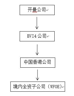 3、在BVI设立BVI4公司,再由BVI4公司在香港设立一个全资子公司(中国香港公司),中国香港公司在境内再设立一个全资子公司,即外商独资企业(以下简称“WFOE”)。