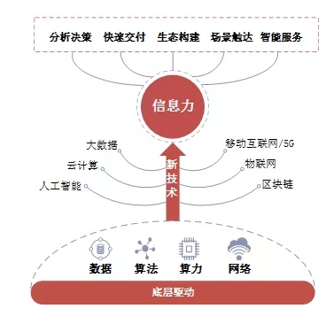 信息力不是一个抽象概念,它是数字经济时代所特有的一种新的企业能力,能够汇聚巨大的能量并释放威力。它的底层燃料包含数据、算法、算力、网络。数字化是在信息化的基础上把业务转化为数据,并以数据驱动业务的发展;算法和算力可以驱动业务流程,将系统智能化并协助企业开创新的业务模式;网络则通过信息技术的手段将系统、业务从线下逐步往线上迁移。实际上,数据、算法、算力、网络是对业务进行重塑的信息力的原始动力,也是推动企业向数字化、网络化、智能化的方向演进的原始动力。在数字经济时代,数据是与矿物和化学元素一样的原始材料或资源,而且由于数据具有不断更新特征,它更像是流淌的血液,可以为企业带来各种营养。作为数据处理的软件和硬件,算法和算力体现了对数据资源的利用水平,也是体现企业数字化能力的基础。算法是信息力的灵魂。算法迭代是从技术层面的创新到思维方式的转变,意味着智能化乃至社会生态的无限可能。算法的“外壳”是软件系统,“核心”是对数据资源的有效运用。而算力则是信息力的技术基础,其作用表现在运行时间减少、功耗降低、开发效率提高等方面。网络的高度渗透催生了计算能力的飞速提高。算法和算力既相互制约,也相辅相成。在全面数字化时代,超大规模不断更新的大数据集将进一步推动算法的不断创新,并对算力提出更高的要求。从对信息力底层驱动的分析可以看出,信息力能够协助企业持续完成大数据的采集和储存,然后开发相应的算法并运用算力对数据进行有效的搜寻、处理和分析,以期获得有价值的信息来辅助决策和动态适应市场,进而形成持续竞争优势。该过程具有内生化性质,由于数据类型特点的高度异质性,导致信息力的获得方式、路径都呈现很强的个性化,因此企业信息力很难被模仿和替代,并具有稀缺性。随着传统产业全面数字化转型升级,通过组装信息力的底层驱动可以构建新的技术引擎,如大数据、人工智能、云计算、移动互联网5G、物联网、区块链等。它们如马车一样拉动着企业快速增长,并为企业数字化转型赋能。比如谷歌、亚马逊、BAT等互联网公司,正在以人工智能、大数据、云计算、区块链等创新技术颠覆旧秩序。信息力已成为这些企业新的核心竞争力。信息力的构建方式