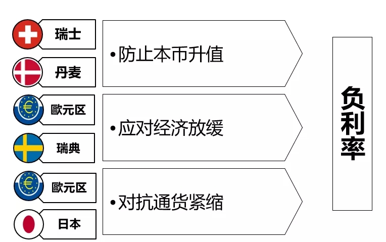 总体来看,实行负利率政策的国家都曾面临ZF债务率增加、本国货币面临升值压力、GDP增长滞缓、失业率居高不下等宏观经济问题,此为推动这些国家央行实施负利率政策的重要因素,但这些因素在各国主要政策目标中轻重不一,也就是说,不同国家实施负利率的主要目的有所差别不同的。