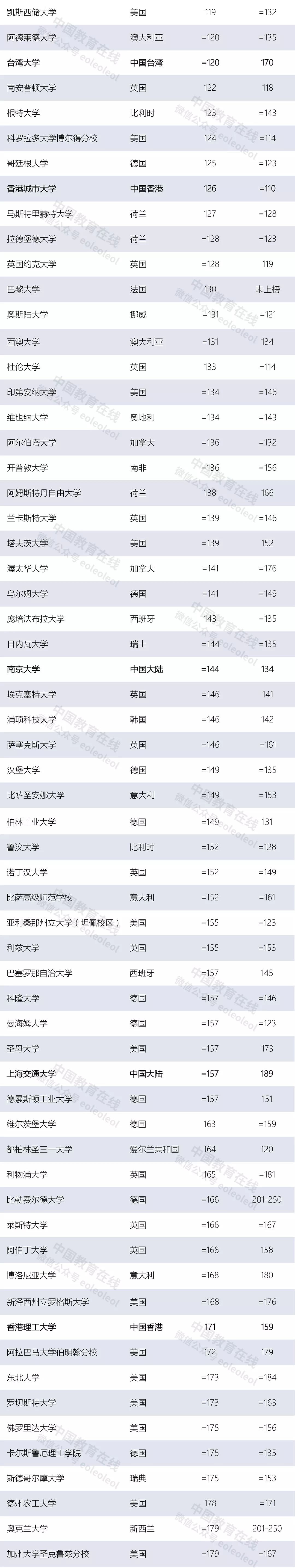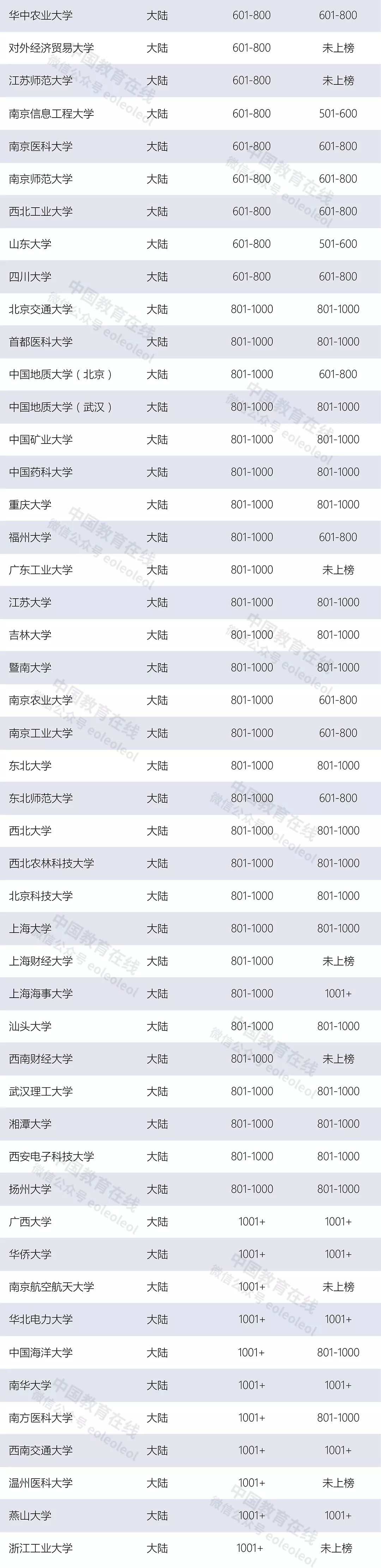 其他六所新上榜的中国大陆高校也进入了前1000名,分别是电子科技大学、对外经济贸易大学、江苏师范大学、广东工业大学、上海财经大学、西南财经大学,其余三所的排名则位于1000名之后,分别是南京航空航天大学、温州医科大学、浙江工业大学。