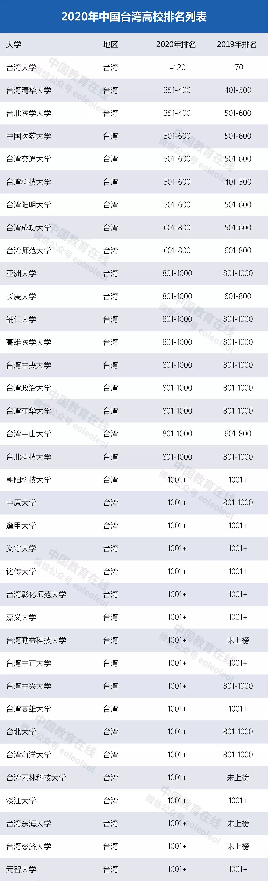 此外,台湾清华大学和台北医学大学都进入了世界大学排名前400名。本次新上榜的四所大学都位于1000名之后。