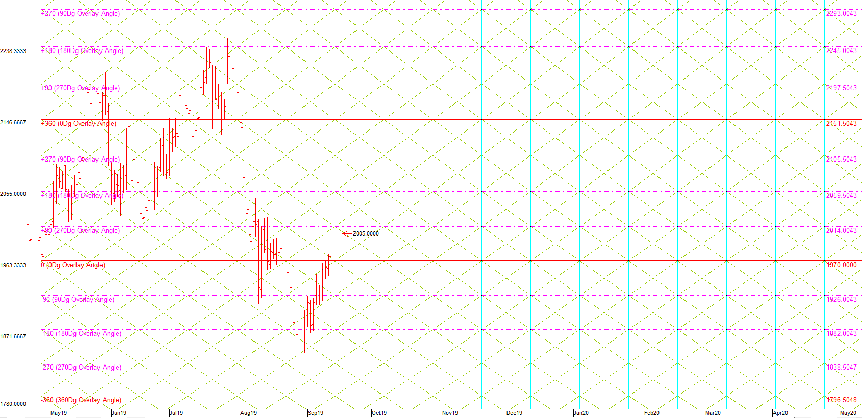 The second FLD pattern sequence (ref #1)projects a price movement UP to a target of 2146.81 by about 2019/10/5. Pricemight cross OVER the 75 day FLD on 2019/9/16 & level: 2012.29 however thisFLD cross is too late in the cycle to be considered valid, and so it is morelikely that the FLD will form resistance at this level.