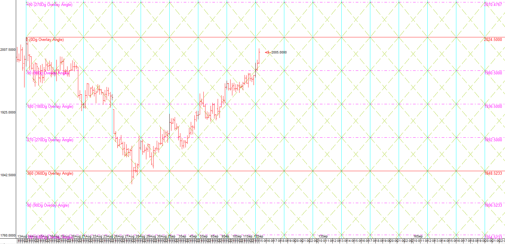 37.2d Normal FLD projection created on2019/9/10 projecting a price rise of 123.5000 to 2078.0000 by 2019/9/23. Thisis still a valid projection target.