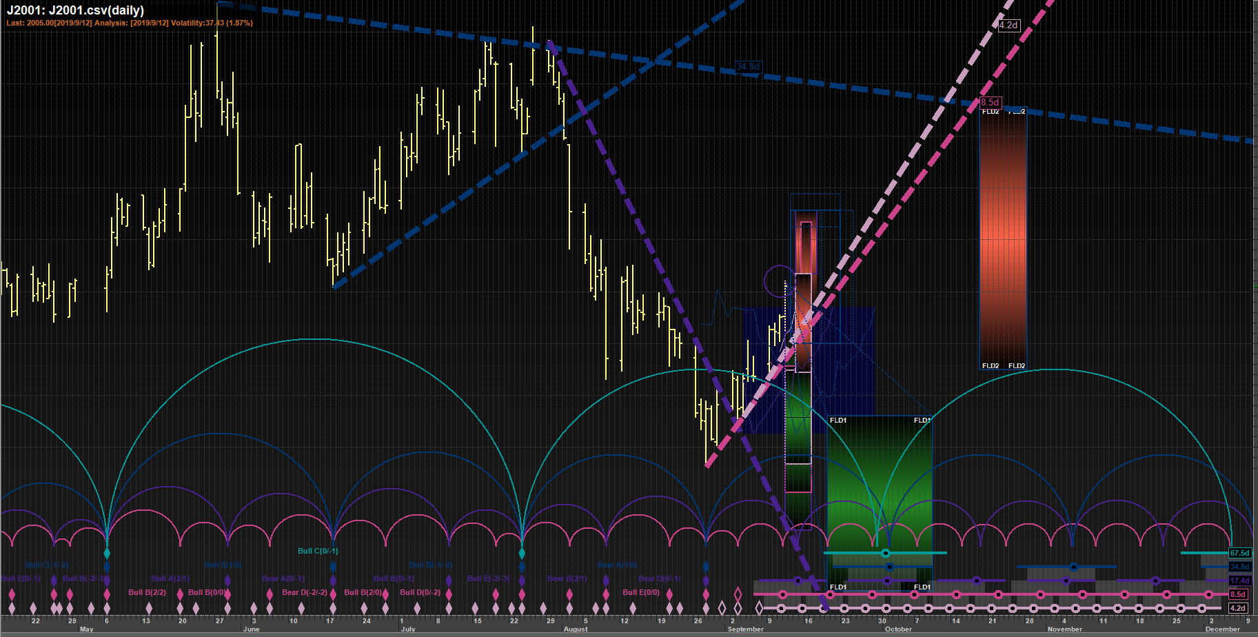 The first FLD pattern sequence (ref #0)projects a price movement DOWN to a target of 1883.25 by about 2019/8/22.
