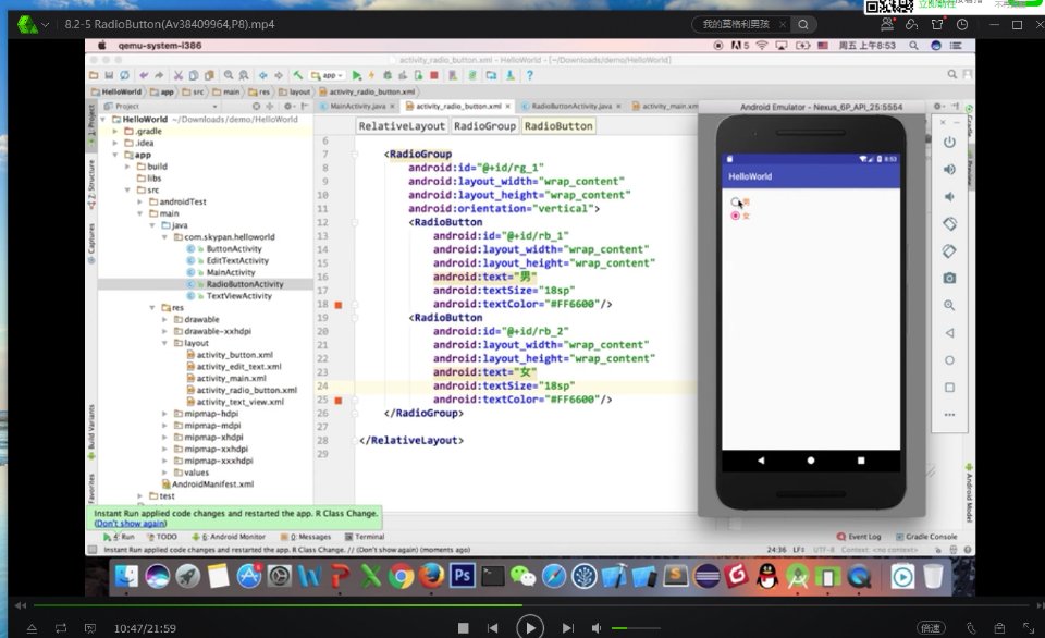 对着视频敲的Android studio 的代码,今天学习radio button,需要和radiogroup一起使用,默认选择用checked为true