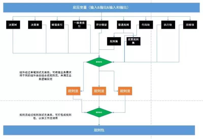 而决策引擎里的最小的细胞单位组成是变量,而变量组合成一个个对应的规则包。最后每一个风险方案都是以规则包的形式配置的,再以业务流程作为交互。