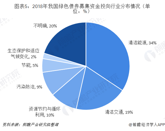 2018年,绿色债券募集资金投向清洁能源领域金额最高。按照中国金融学会绿色金融专业委员会编制的《绿色债券支持项目目录》规定的六个领域划分,2018年在我国绿色债券募集资金投向中,清洁能源是资金投向最多的领域,占比34%,主要为水电站、风电站和光伏项目建设;其次是清洁交通,占比19%,主要为城市轨道交通和城际铁路项目建设运营;生态保护和适应气候变化最少,占比仅2%。