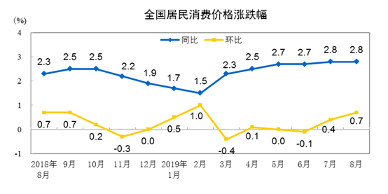 2019年8月份,全国居民消费价格同比上涨2.8%。其中,城市上涨2.8%,农村上涨3.1%;食品价格上涨10.0%,非食品价格上涨1.1%;消费品价格上涨3.6%,服务价格上涨1.6%。1--—8月平均,全国居民消费价格比去年同期上涨2.4%。