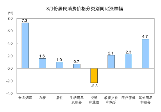 8月份,全国居民消费价格环比上涨0.7%。其中,城市上涨0.6%,农村上涨1.0%;食品价格上涨3.2%,非食品价格上涨0.1%;消费品价格上涨1.1%,服务价格上涨0.2%。