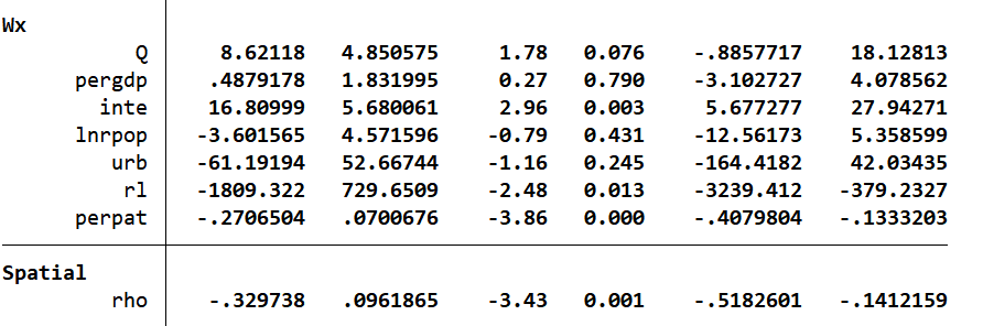 然而,若rho(误差项的空间自相关系数)为负,则表示在未被模型解释的其他因素中存在负向的空间相关性。换句话说,在某一区域出现的异常情况(如经济下滑、自然灾害等),可能会对邻近地区产生相反的影响,比如促使它们采取措施以减少自身风险或损失。