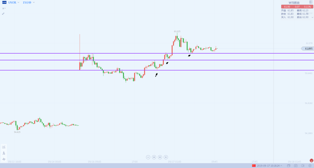 原油如图,在沙特爆炸之后,原油暴力上涨,但是不同于黄金,原油的上涨是由供给方减少支撑,而未来几个月在产油设备没有维修好的时候,世界原油将面临每天570万桶的供给减少,短期原油深调是比较难了,一小时都看不到上涨的足迹,从15分钟图可以看到明显的顶底转换以及拐点支撑,那么今天只需要围绕支撑做多即可,日内分水岭61.4,在此上方保持强势上涨节奏,破位则转为震荡上涨。操作上回撤61.3做多,损在60.7,目标看向62.6即可。