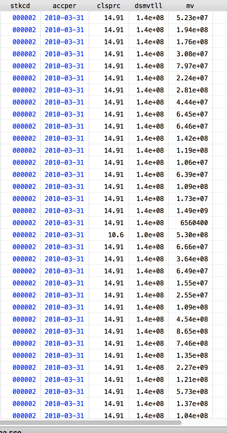 现在我有不同的stkcd的编号,有不同的时间(一共七年,每年四个季度末),并且已经收集到每个时间点的市值mv。