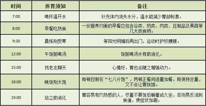 据专家介绍,对胃不好的人而言,生活有规律尤为重要。根据多年的临床经验,总结了一个“养胃时刻表”,不用吃那些养胃的药,一样可以起到养胃的作用(见附件)。