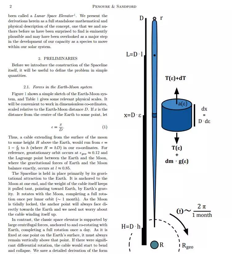 这篇论文的两位共同作者Penoyre和Sandford都是哥伦比亚大学天文学研究生,他们将这个月球空间电梯称为Spaceline。其中心环节是一条长达20万英里(32万公里)的线缆,一头固定在月球上,另一头指向地球上方,可能位于距离地球27000英里的轨道上。(由于月球的相对运动,线缆无法固定在地球表面。)