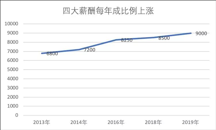 值得一提的是,大陆四大每年的薪资都会成比例上涨: