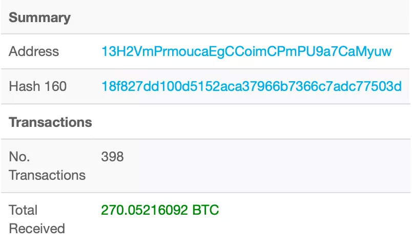 根据区块链浏览器的数据,截止目前,光接收到的 BTC 捐赠就高达 270BTC,其中绝大部分 BTC 捐赠发生在 2016 年年中至 2017 年年中。