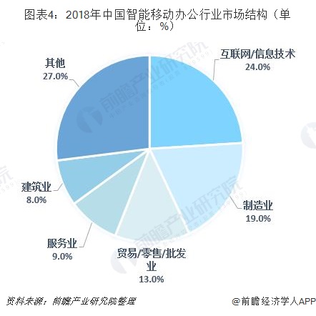 从各行业对智能移动办公行业需求市场来看,2018年互联网/信息技术行业对智能移动办公产品需求最高,达到24%,其次为制造业,占比为19%,贸易/零售/批发行业需求市场占比为13%。