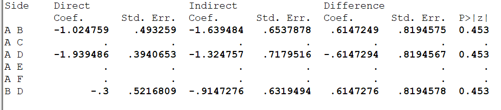 向各位老师求助,在使用stata做网状meta分析的节点分析时,出现了两两比较间P值相同的情况,请问是什么原因,是因为网状meta分析中仅存在一个闭合环吗?请老师们指教。