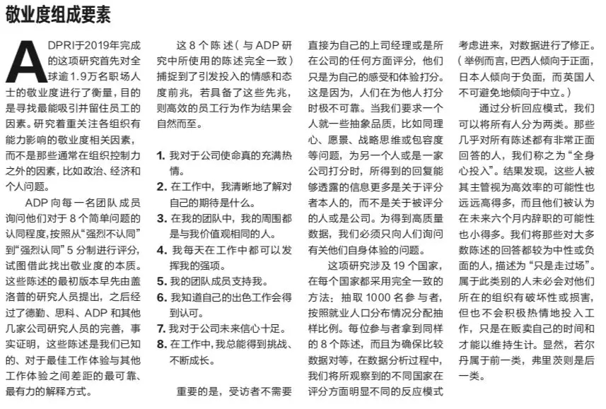 本文作者之一马库斯,一直与盖洛普合作进行有关敬业度的研究,前不久他加入了ADP Research Institute (简称ADPRI),牵头负责该机构关于员工与职场表现的研究项目。他和他的团队已完成的“全球敬业度调查”,是迄今为止所有研究中范围最广、方法最为一致的。这项调查涵盖19个国家各1000名在职成年人,要求受访者针对8条衡量敬业度的表述做出回答。研究发现的结果之一是,全球范围内大约只有16%的员工像若尔丹一样全身心投入工作,而大约84%的员工与弗里茨一样只是在走过场混日子。