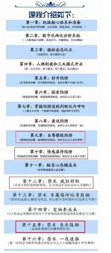 也就是说,PUA中毒者与异性交往,不是为爱,也不是为情,而是为财与色。所以,他们会疯狂猎艳,使用套路,不择手段地骗人上床,并进行情感控制、榨取钱财。PUA课程里还有很多包括精神虐待和精神控制的心理学原理。包括“自尊摧毁”、“情感虐待”、“疯狂榨取”、“自杀鼓励”。