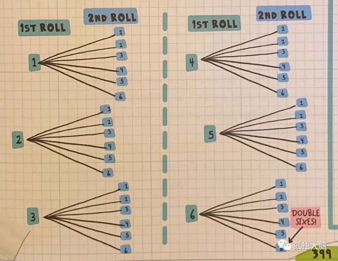 扔两个骰子,其实是它们的宇宙分裂了两次,如下图: