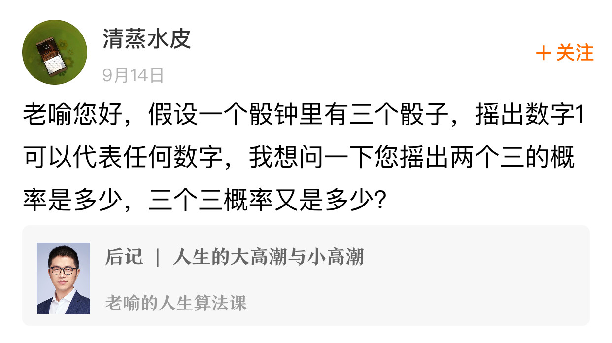 大部分问题都是人生和工作难题,我尽量显得机智而有诚意地回答(目前已经快装不下去了)。偶尔也有数学题,例如下面这个: