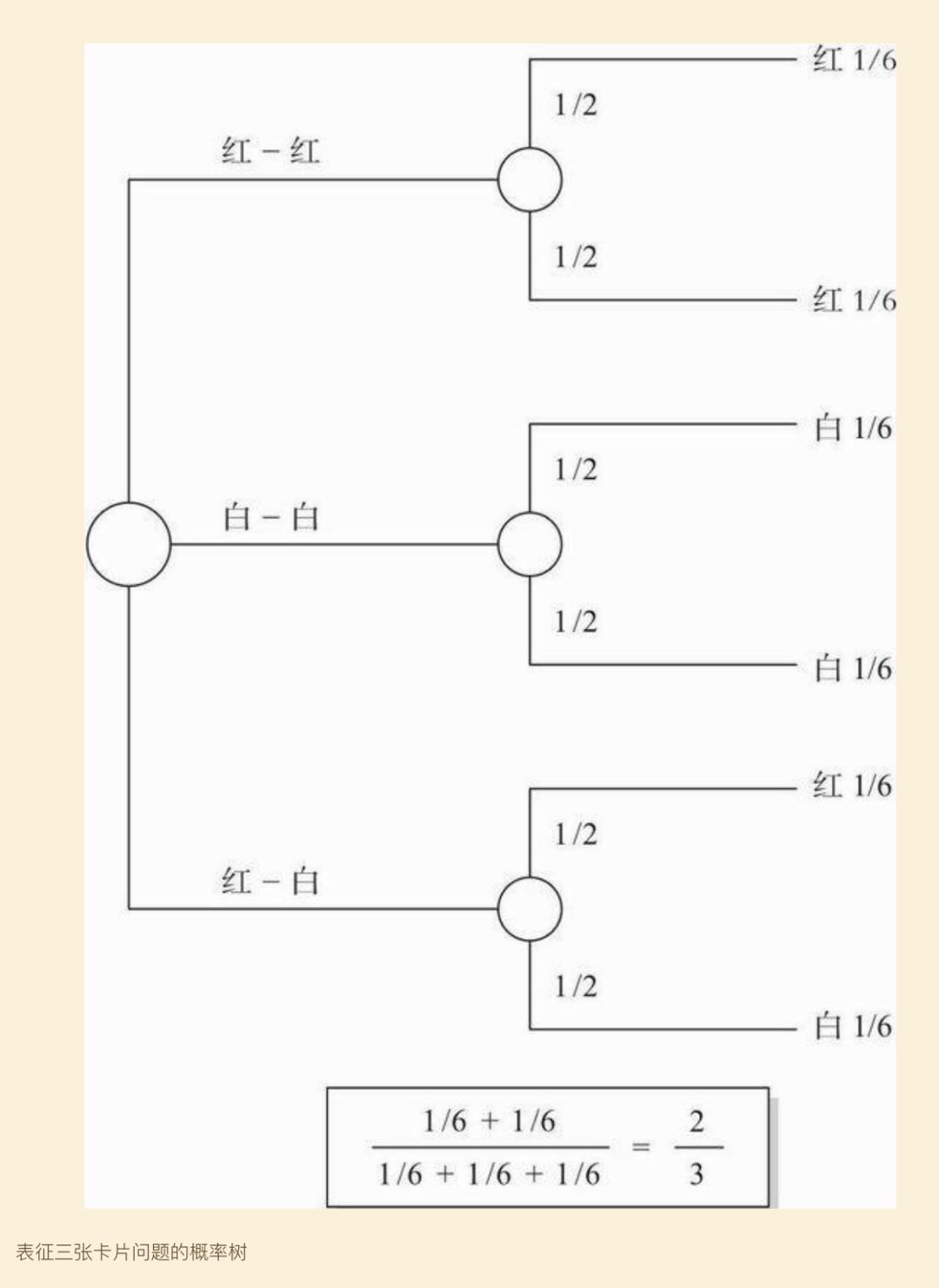 三张牌可以分裂成(上图右侧的)6个平行宇宙,牌面是红色的有3个,这3个中,有2个是红-红牌。