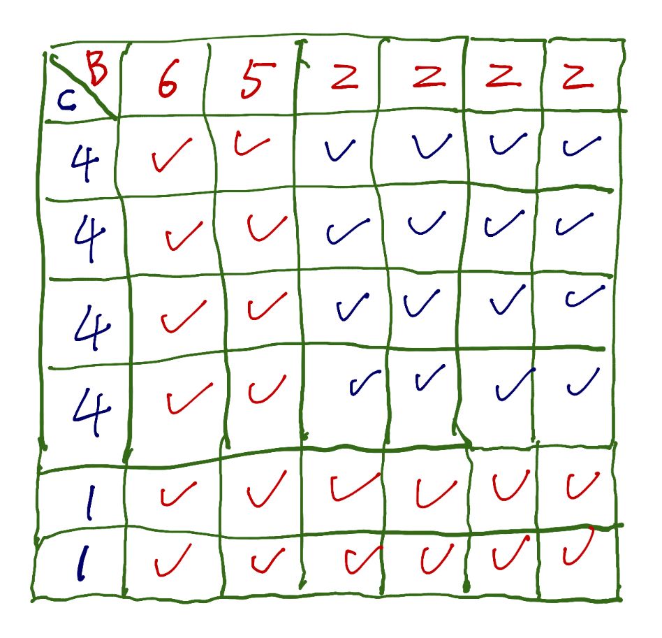 横向的红色,是B的六种可能。纵向的蓝色,是C的六种可能。