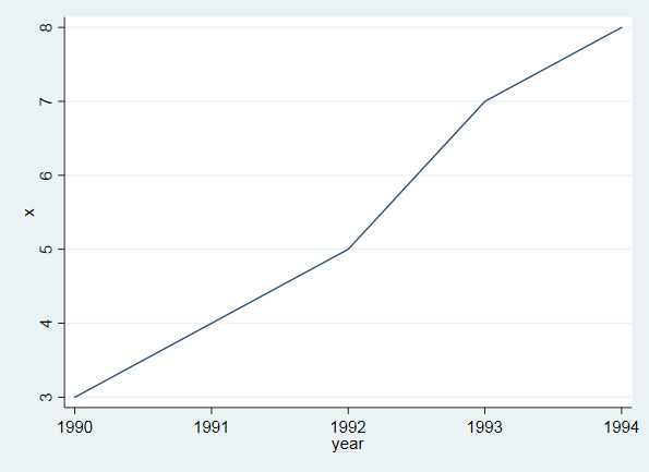 蓝色 发表于 2019-9-20 15:20 不会是你说的那样 下面例子1991年数据是缺失的 作图的时候是不会考虑的