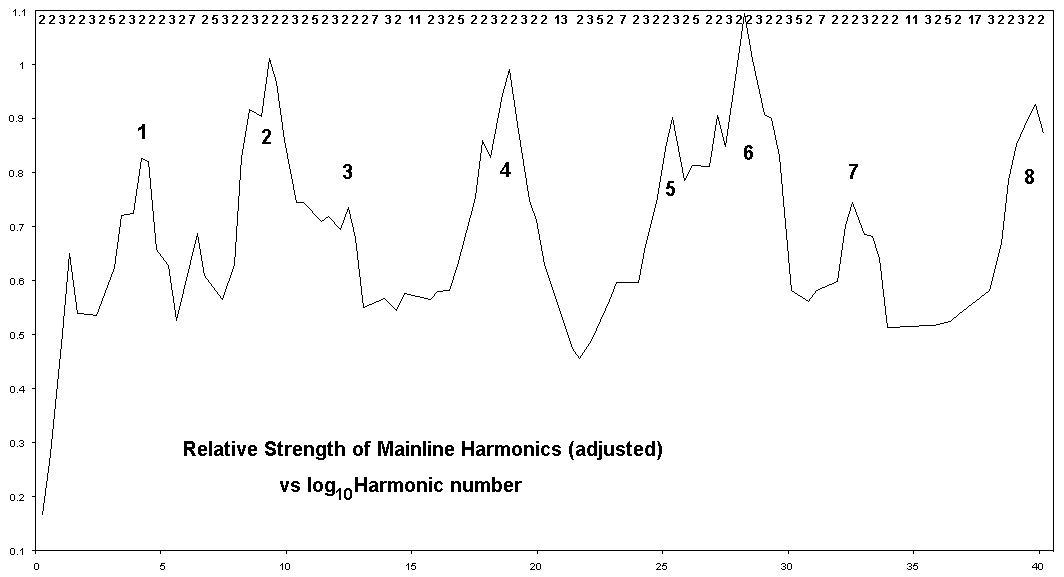 Thereare a series of major peaks at about 4.5 differences in log10(H) the first ofwhich is the strong harmonic 34560 (and its mate 17280). Early in my harmonicsstudies I realized that these peaks occurred after each time the prime 5appeared and that they were at ratios of about 34560 apart. It was also seenthat secondary peaks happened after each ratio of 3 in the main line. To makethese things clear, the main line harmonic ratios are shown along the top ofthe graph. Additional peaks and troughs are caused by the higher primes whichlargely determine the variations in the shapes and spacings of these fairlyregular peaks.