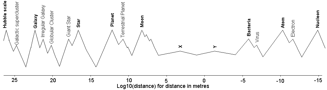 Hereis a schematic which shows accurately the distance scales between occurrencesof each type of object. The line is a crude representation of the relativestrength of each type of energy formation with major scales shown in bold andrelated secondary scales not in bold.