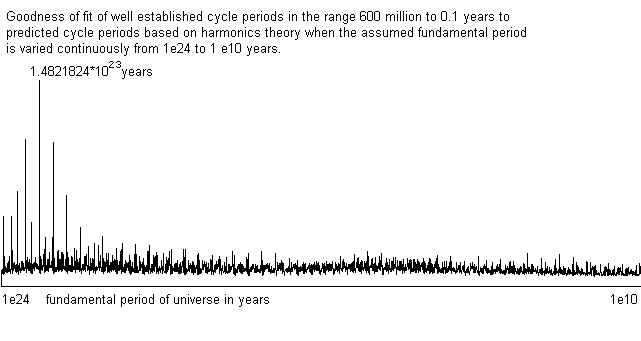 Theabove graph shows the result of comparing many cycles with accurately knownperiods in the range of 600 million years down to about a month to the patternof predicted harmonics when various different values for the fundamental cycleare tested. The Hubble scale is near the extreme right and values were testedcontinuously through to 10^24 years. A series of peaks, all far moresignificant than any others, appear centered on 1.4821824*10^23 years. Thereason for the multiple peaks is that the harmonics are very similar whendisplaced by a factor of 2 and quite similar at factors of 3, 4, 6 and 3/2.