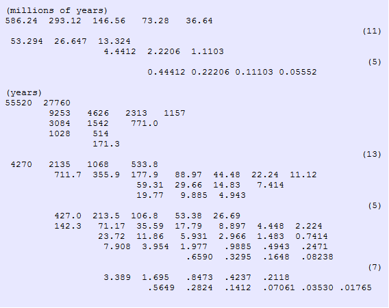 Thefollowing table shows commonly reported cycles periods that are linked by exactprime number ratios and includes many accurately measured cycle periods. Thetable has ratios of 2 horizontally and 3 vertically, except where larger primeratios are shown on the right side.