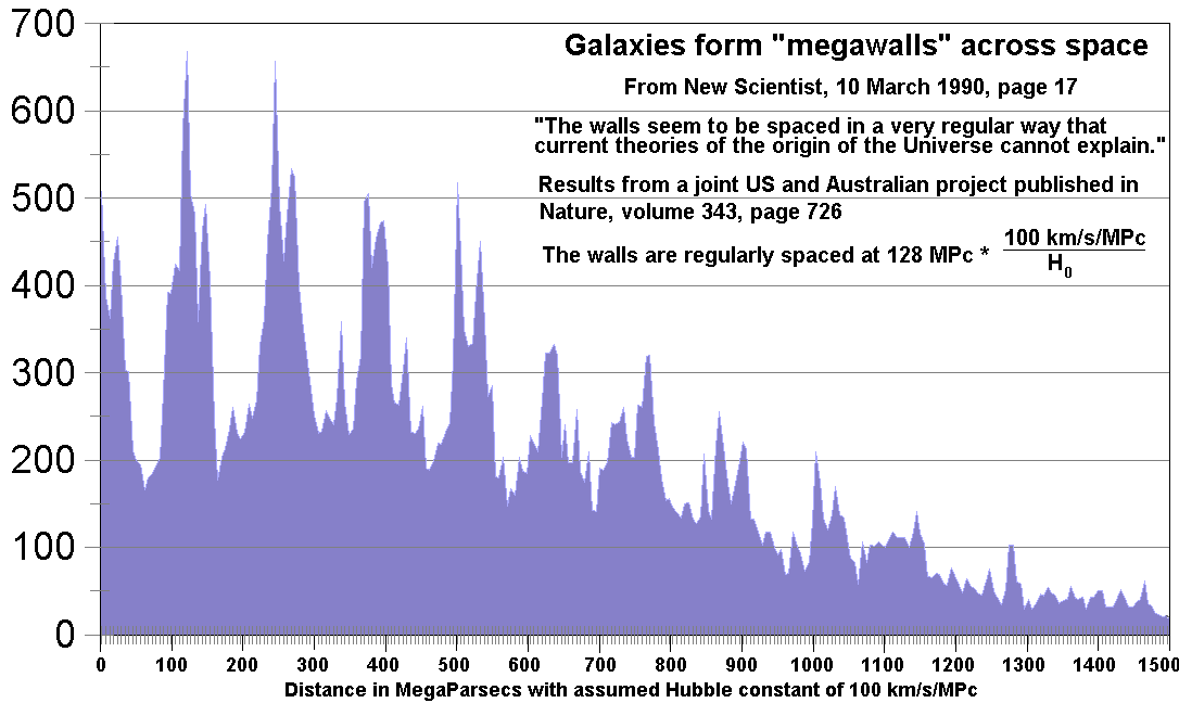 Hereis one of a number of cosmological studies that show that galactic superclusters exist at regularly spaced intervals. The quote from New Scientist inthe graphic is no longer correct, there is a theory that expected not only thatsuch structures existed but correctly predicted the spacings. That theory isthe Harmonics theory, and it links these large structures with huge waves inthe universe and the period of waves of just this size are found as one of thestrongest geological cycles periods. Because that cycles period is knownaccurately it allows the accurate determination of the Hubble constant,something not yet achieved by "existing theories".
