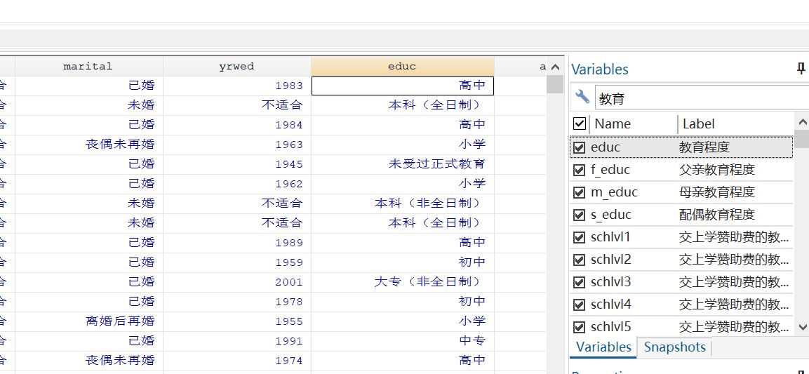 STATA新手求助!如何用STATA软件筛选出最高学历为“小学”和“未受过正式教育”的样本?该变量名称为educ