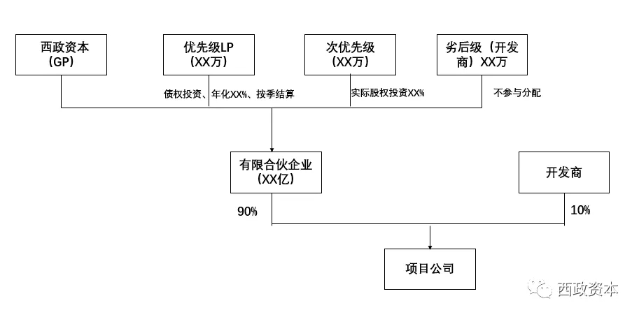 一般操作的思路和方案大致如下:1.资金来源:具体如上所述,需要特别说明的是,机构资金、国企或民营金控平台等资金有额度限制,比如有些国企金控平台到了第四季度开始收缩业务规模和额度,因为第四季度全面进入资金回收和年度业绩盘点。而外资机构资金会受国家贸易形势的影响,出现额度和成本的双重调整等现象。2.融资主体:百强开发商或当地龙头(一般资产总规模和累计开发面积是判断的依据之一)下属项目公司。融资方案设计前,我们需了解是否已经成立项目公司,因为一般机构LP会要求一起成立新的项目公司(债务干净,且缩短尽调时间),如果项目公司已经成立,且已开始了招拍挂手续的办理,则一般会要求对项目公司的证、章、照先行监管或要求股权过户。3.融资方式:明股实债、股+债、过桥资金+土地前置抵押等。(1)明股实债:该方式较为常规,具体细节可以查阅西政资本之前的专题文章,本文不做赘述。(2)股+债:前期先以债的形式进入,到开发贷阶段资金退出,此阶段的成本一般在年化16-18%不等。后端真股进入,同股同权,股权比例在10-20%不等,项目达到工程总量的一定比例退出,比如80%-90%等 。具体架构如下: