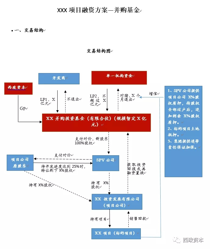 目前招拍挂市场竞争激烈,因此地产项目收并购市场仍然非常火爆,特别是一些外地开发商新进入一个市场,更多通过收并购方式解决项目获取的问题,还有一些中小型开发商因现金流出现问题,也出现项目“转让潮”。(一)融资方式纵观实操中针对收并购项目的融资方式主要有:1.银行并购贷:目前主要有2种情况下来操作并购贷,一种是真实的项目并购贷,但目前很多银行要不就是准入门槛非常高,比如只操作前30或50强,要不就是额度非常小,无法满足开发商需求,因此目前市面上还有一些股份制银行、城商行和村镇银行的操作还比较灵活,要不就是银行已经全面停止了涉房业务,包括并购贷和开发贷、城市更新贷等业务,整体而言还是无法满足开发商的并购融资需求。另一种是作为放款通道,据西政财富中心同事反馈,有开发商尝试通过其他项目的并购贷款来为拿地配资的项目提供资金,当然该方式合规性不在本文讨论范围,因此不做详细展开。2.信托并购贷:跟上述银行并购贷的情况差不多,不做赘述。3.并购基金,具体架构如下,因细节较为繁杂,读者可以私下跟西政资本或西政财富团队做详细的交流和沟通。