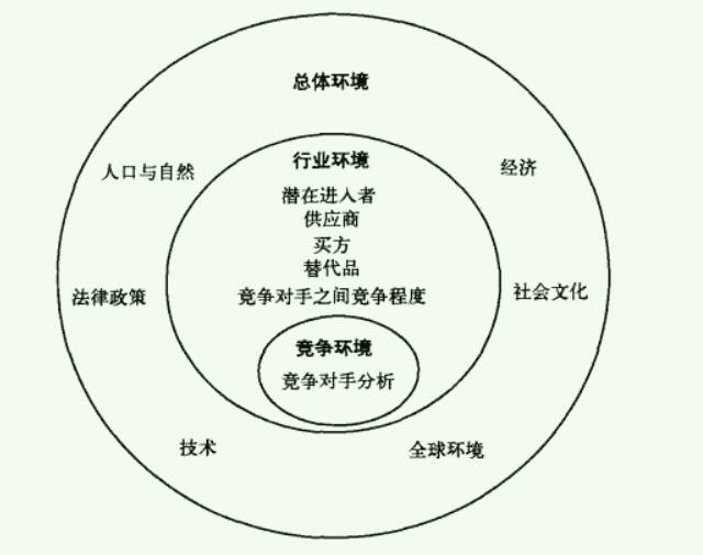 企业的外部环境分析一般分为三个主要层次:总体环境、行业环境和竞争环境.
