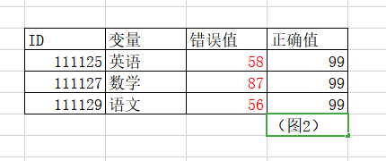 举个例子,我有一个数据集(图1),里面不同科目的某一些值后期检查时发现错误(图1标红部分),需要批量更改替换,已整理出错误的数据对应的“ID",”变量名“,”正确值“,汇总为另一个表格(图2),r语言中如何实现通过【图2】中的内容弄批量更改替换到【图1】中呢?
