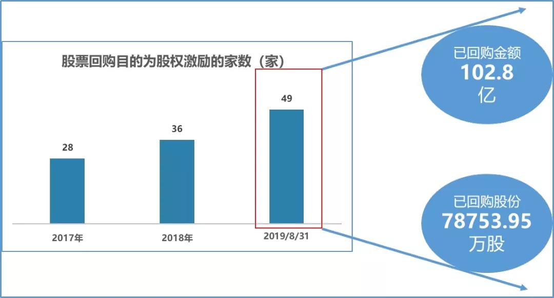 通过上图可明显看出:自新政出台之后,全部A股上市公司自2019年1月1日-2019年8月31日,总共有49家实施了股份回购且回购目的为实施股权激励,明显高于2017年全年的28家,2018年全年的36家。