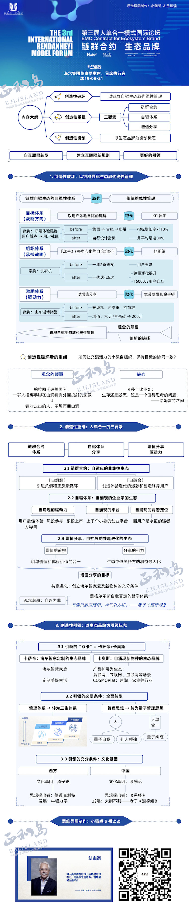 在9月21日召开的第三届人单合一模式国际论坛上,海尔集团董事局主席、首席执行官张瑞敏做了重磅演讲,详细讲述了人单合一模式的新发展。以下为精编内容,正和岛获独家授权发布。