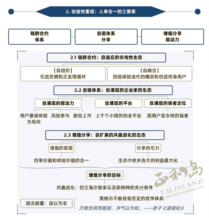 “人单合一”三要素是:链群合约、自驱体系、增值分享。