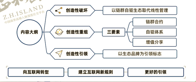 传统企业都是线性组织,而链群是非线性组织,根据用户体验,随时自我组合。对企业来说,无非三大块:目标体系、组织体系、激励体系。