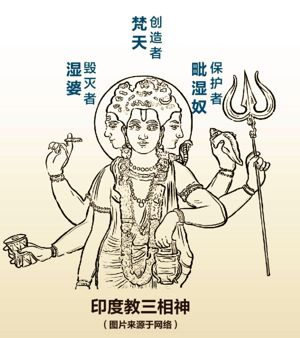 为了更形象地说明这个问题,这里有一张印度教三相神的图片。印度教有几千个神,主神只有三位:梵天是创造者,湿婆是毁灭者,毗湿奴是守护者。